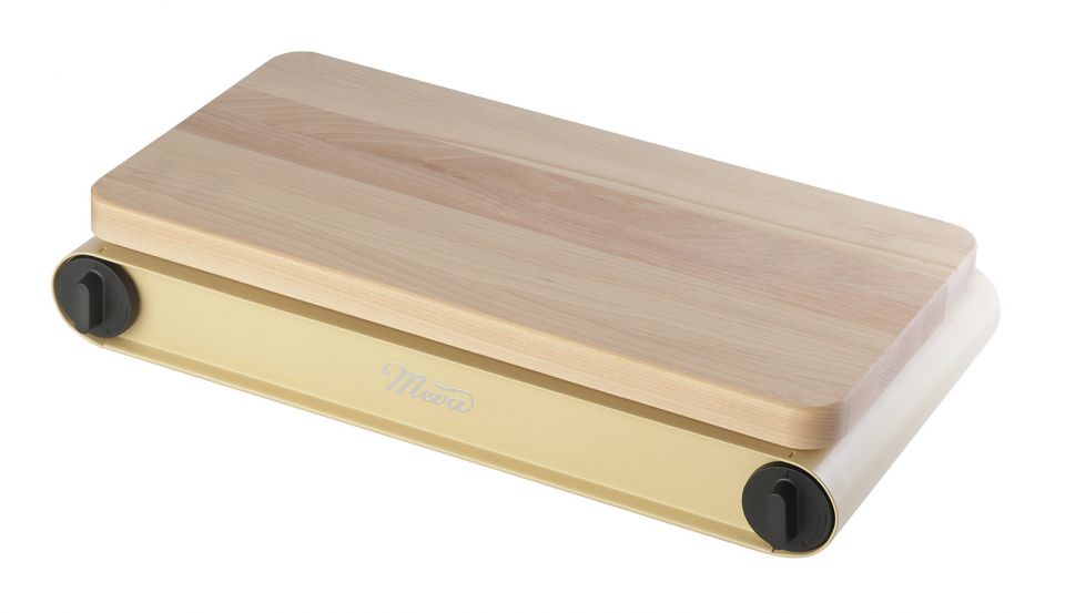 - Die LUX-Version verfügt über ein integriertes Schneidebrett aus massivem Buchenholz, das zum Schutz des Brenners, in erster Linie jedoch als Schneideunterlage dient.