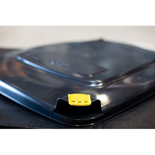 - Der Behälter ist mit farbigen, abnehmbaren Clips an den Deckelgriffen ausgestattet.