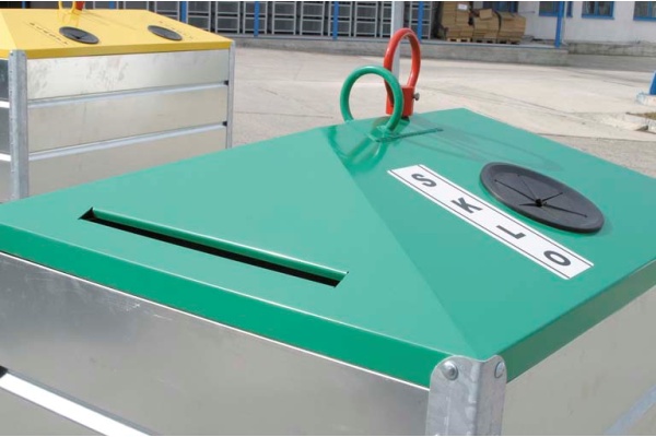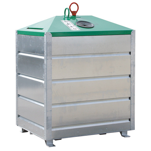 - Der Container besteht aus einem robusten, feuerverzinktem Rahmen, Wänden aus verzinkten Profilblechen und einem Deckel mit Einwurföffnung in der Farbe der entsprechenden Abfallsorte.
