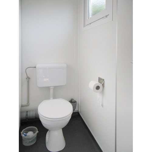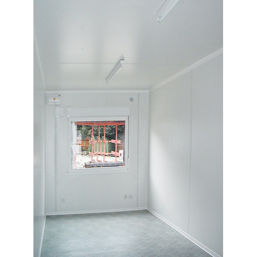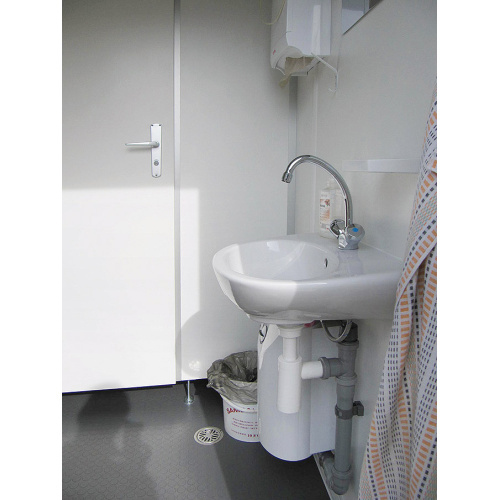 - Ausstattung: Eingangstür 875 x 2000 mm, Innentür 875 x 2000 mm, Innentür 625 x 2000 mm, ISO Fenster 945 x 1200 mm mit Rollo, ISO Fenster 600 x 600 mm, WC, Pissoir, Waschbecken, Batterie, Boiler, Duschkabine, Ablauf, Anschluss Wasser/Abwasser, Trennwand.