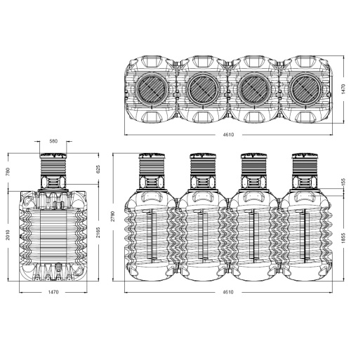 - Die patentierte Rippung der einzelnen Tanks und deren Positionierung unmittelbar neben einander erhöht die Festigkeit und Stabilität der verbundenen Einheit.